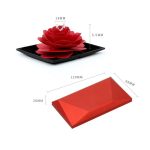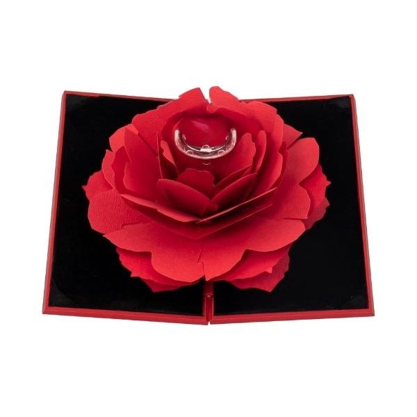 Realizzato con materiali di alta qualità, il sottile smerlo ha un interno in plastica resistente e una morbida flanella per proteggere l’anello, mentre la rosa esterna è realizzata in carta pregiata per un look realistico e senza tempo. Il suo design compatto e discreto permette di infilarlo facilmente nella tasca del cappotto, rendendolo il compagno perfetto per offerte inaspettate, anniversari o regali speciali.
