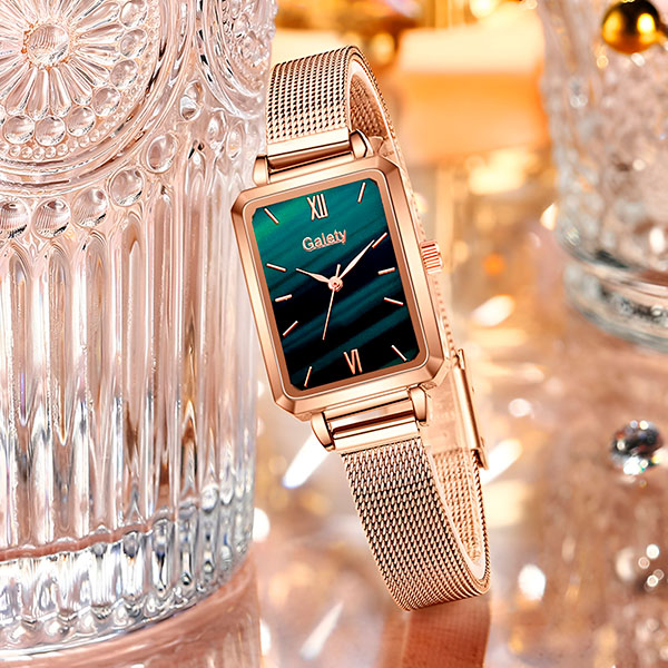 Questo orologio ha un colore oro rosa lucido e un bellissimo quadrante verde. Aggiunge stile a qualsiasi vestito, jeans o abbigliamento formale.