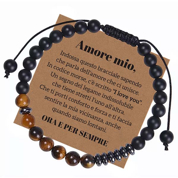 Indossa questo bracciale sapendo che parla dell’amore che ci unisce. In codice morse, c’è scritto “I love you”. Un segno del legame indissolubile che tiene stretti l’uno all’altra. Che ti porti conforto e forza e ti faccia sentire la mia vicinanza, anche quando siamo lontani.