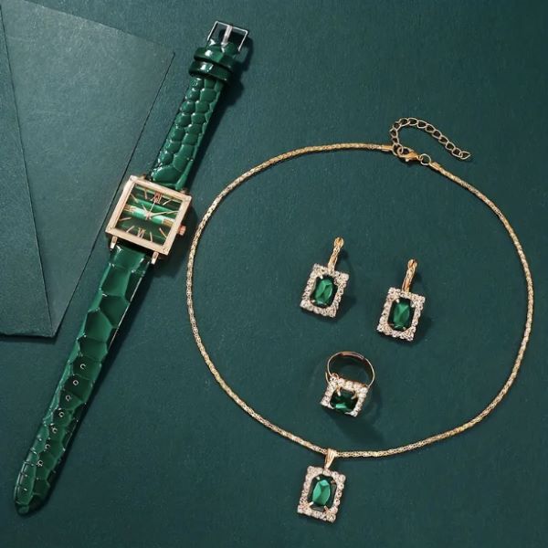 Questo insieme chic è caratterizzato da orologi al quarzo vintage a lancetta quadrata in suggestive tonalità di verde, completati da uno scintillante set di gioielli con strass, che vi permetterà di elevare il vostro stile e di condividere l’eleganza con i vostri cari. 🎁⌚💚